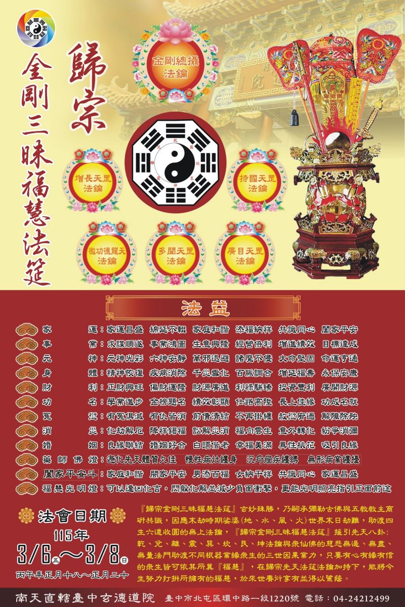 歸宗承領天命啟辦「金剛三昧福慧法筵」,仙佛神恩浩蕩妙法助渡眾生及四生六道得以契其所冀理想目標而了因斷果,駢晉家運興隆、財利、事業、婚姻、身體…等等法益,賡衍今生福慧目標理想之擁有,並得以攜往來世延續享有。