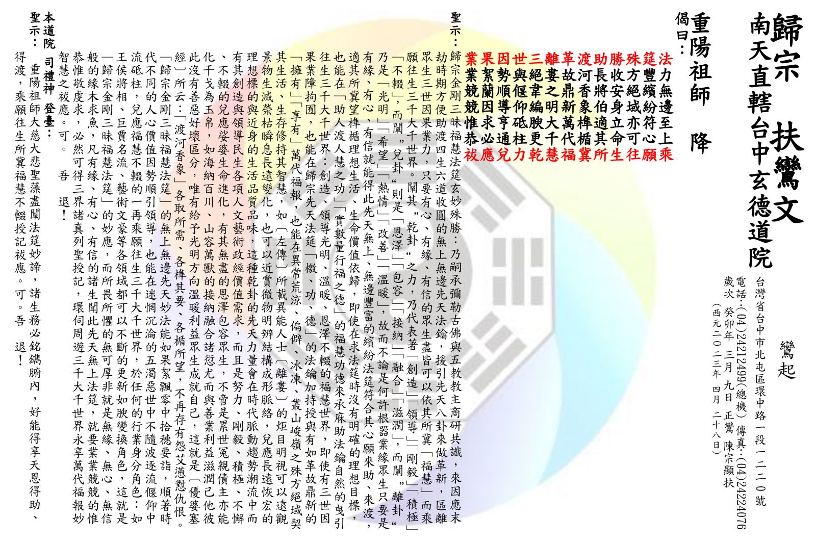 「歸宗金剛三昧福慧法筵」的無上無邊先天妙法能如果絮飄零中拾穗要詣,順著時代不同的人心價值因勢順引領導,也能在迷惘沉淪的五濁惡世中不隨波逐流偃仰中流砥柱,兌應福慧不輟的一再乘願往生三千大千世界。