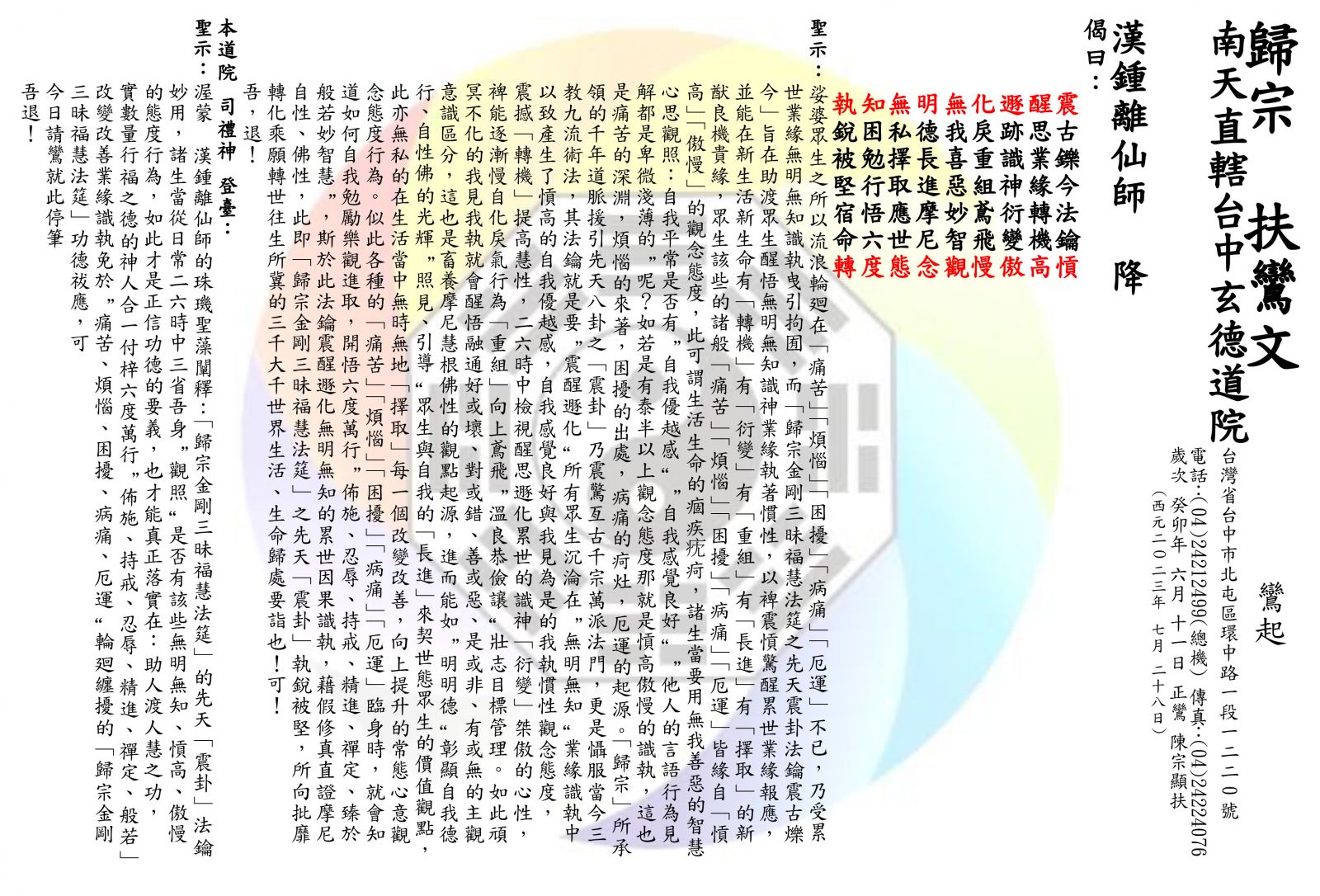 「歸宗金剛三昧福慧法筵之先天震卦法鑰震古爍今」旨在助渡眾生醒悟無明無知識神業緣執著慣性,以裨震愩驚醒累世業緣報應,並能在新生活新生命有「轉機」有「衍變」有「重組」有「長進」有「擇取「的新猷良機貴緣,眾生該些的諸般「痛苦」「煩惱」「困擾」「病痛」「厄運」皆緣自「愩高」「傲慢」的觀念態度,此可謂生活生命的痼疾㽸疴。