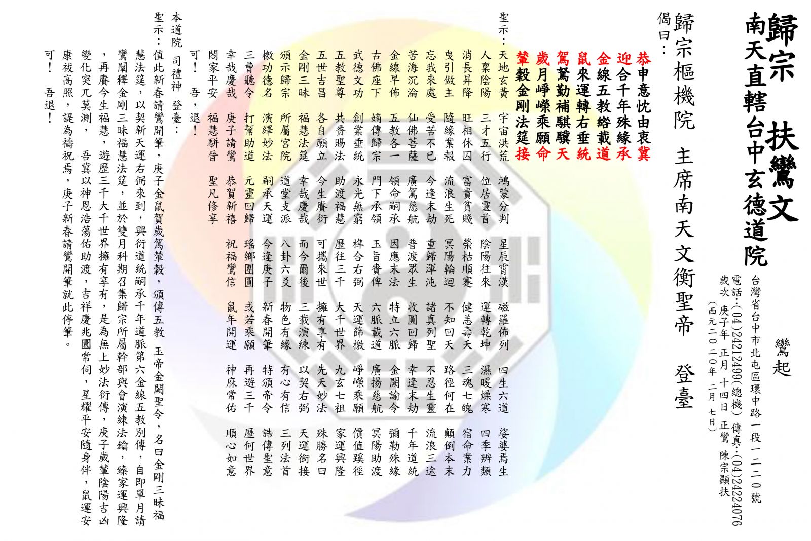 民國109(庚子)年1月14日新春開筆請鸞,歸宗樞機院 主席南天文衡聖帝頒傳五教 玉帝金闕聖令,名曰「金剛三昧福慧法筵」,契新天運右弼來到,興衍道統嗣承千年道脈第六金線五教別傳,以臻家運興隆,再賡今生福慧,遊歷三千大千世界擁有享有,是為無上妙法衍傳。